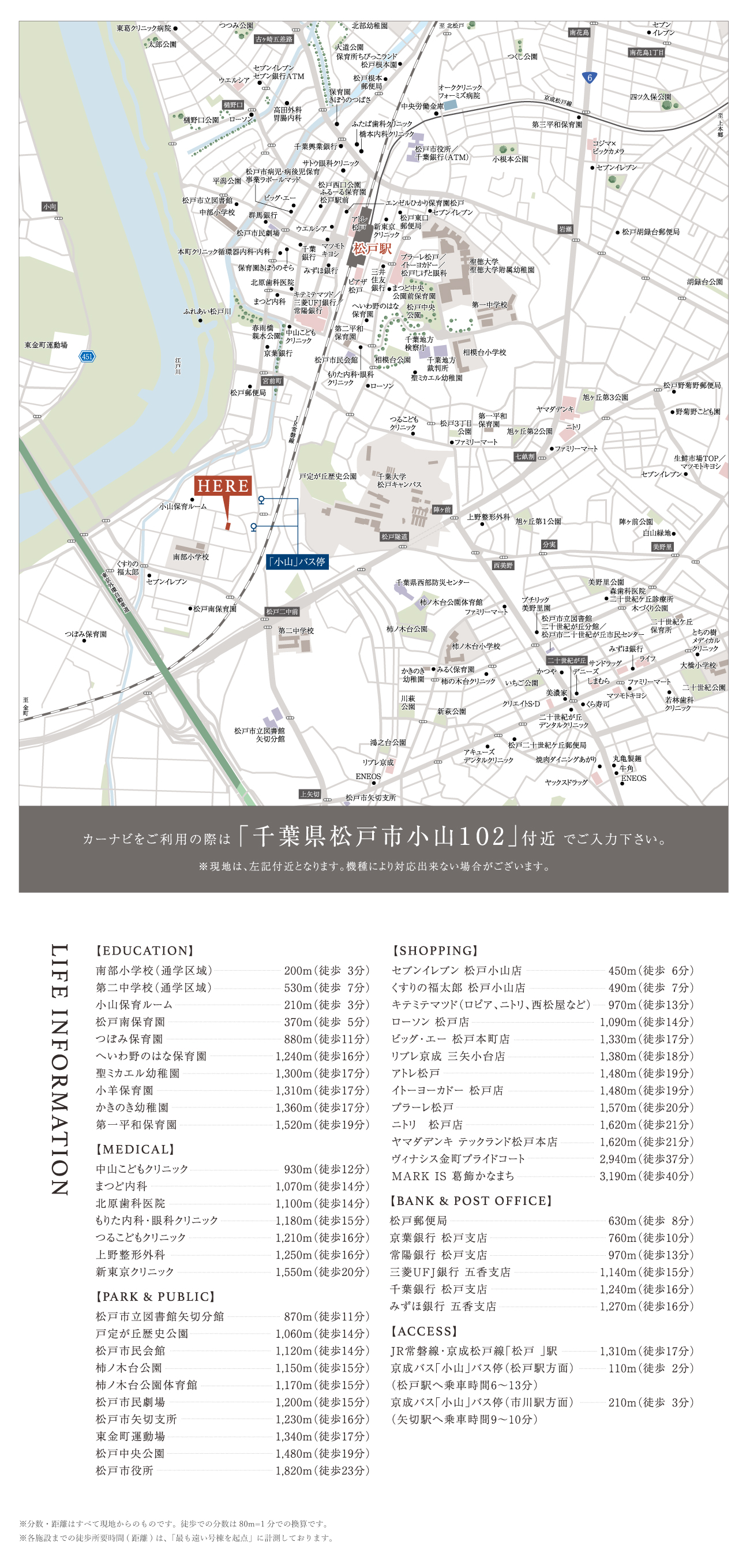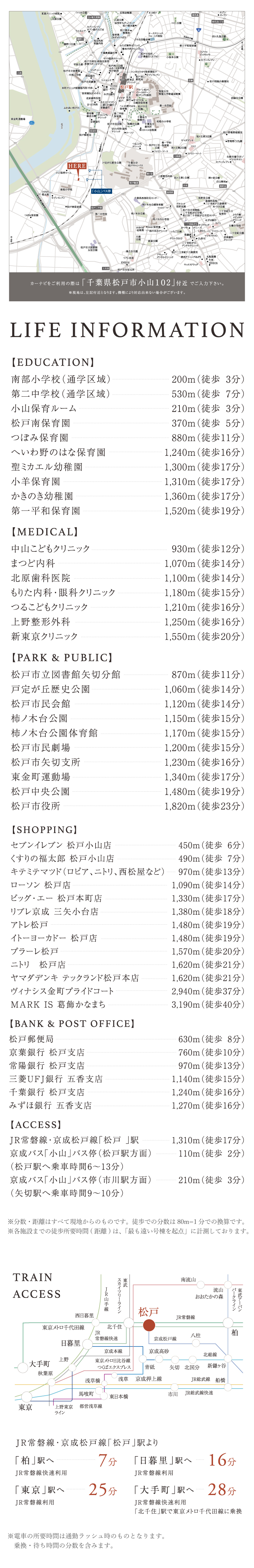 JR常磐線・京成松戸線「松戸」駅までバス6分「小山」バス停まで徒歩2分