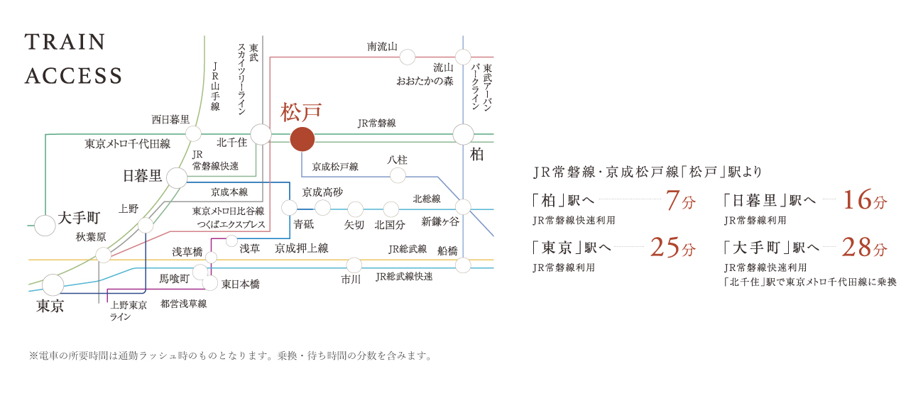 ●松戸駅より大手町駅まで【ラッシュ時: 28分 常磐線(上野行)利用。北千住駅で東京メトロ千代田線(成城学園前行)に乗換。】【平常時: 25分 常磐線(品川行)利用。北千住駅で東京メトロ千代田線急行(唐木田行)に乗換。】