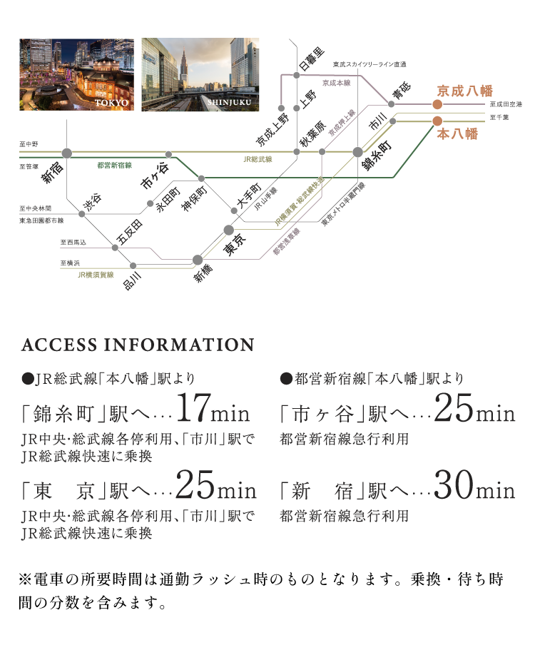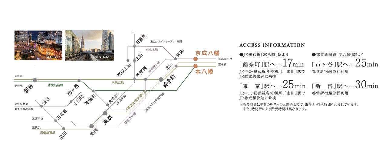 アクセス ●本八幡駅より錦糸町駅まで【ラッシュ時: 17分 中央・総武線各停(三鷹行)利用。市川駅で総武線快速(大船行)に乗換。】【平常時: 16分 中央・総武線各停(中野行)利用。市川駅で総武線快速(久里浜行)に乗換。】
