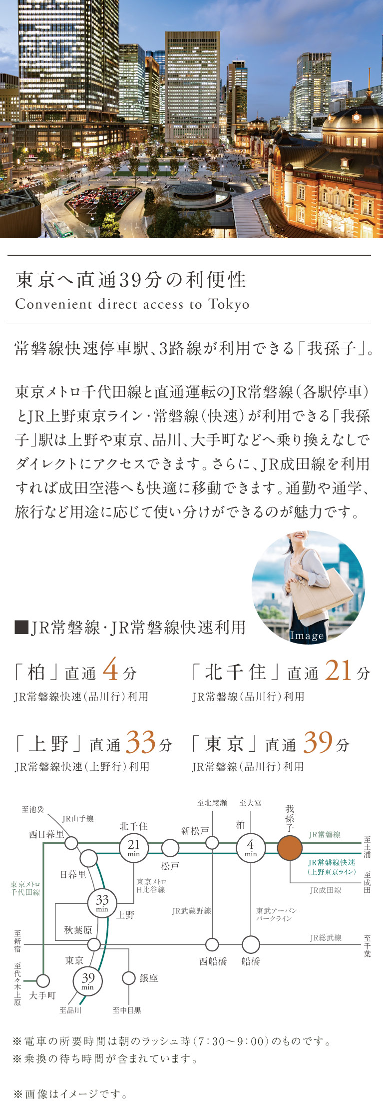 ●我孫子駅より上野駅まで【ラッシュ時: 33分 常磐線快速(上野行)利用。】【平常時: 31分 常磐線(品川行)利用。南千住駅で東京メトロ日比谷線(中目黒行)に乗換。】