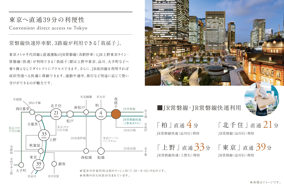 ●我孫子駅より東京駅まで【ラッシュ時: 39分 常磐線(品川行)利用。】【平常時: 40分 常磐線(品川行)利用。】