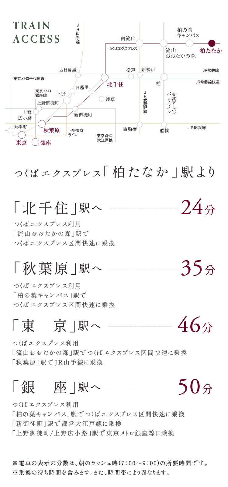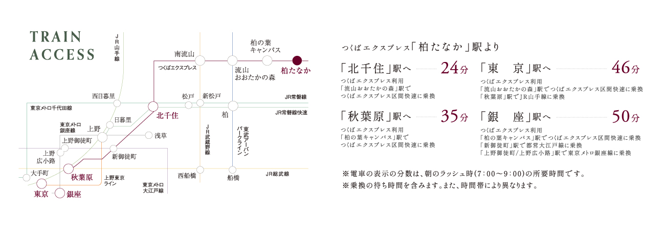 ●柏たなか駅より東京駅まで【ラッシュ時: 46分 つくばエクスプレス(秋葉原行)利用。流山おおたかの森駅でつくばエクスプレス区間快速(秋葉原行)に乗換。秋葉原駅で山手線外回り東京方面行に乗換。】【平常時: 42分 つくばエクスプレス(秋葉原行)利用。八潮駅でつくばエクスプレス快速(秋葉原行)に乗換。北千住駅で常磐線特別快速(品川行)に乗換。】
