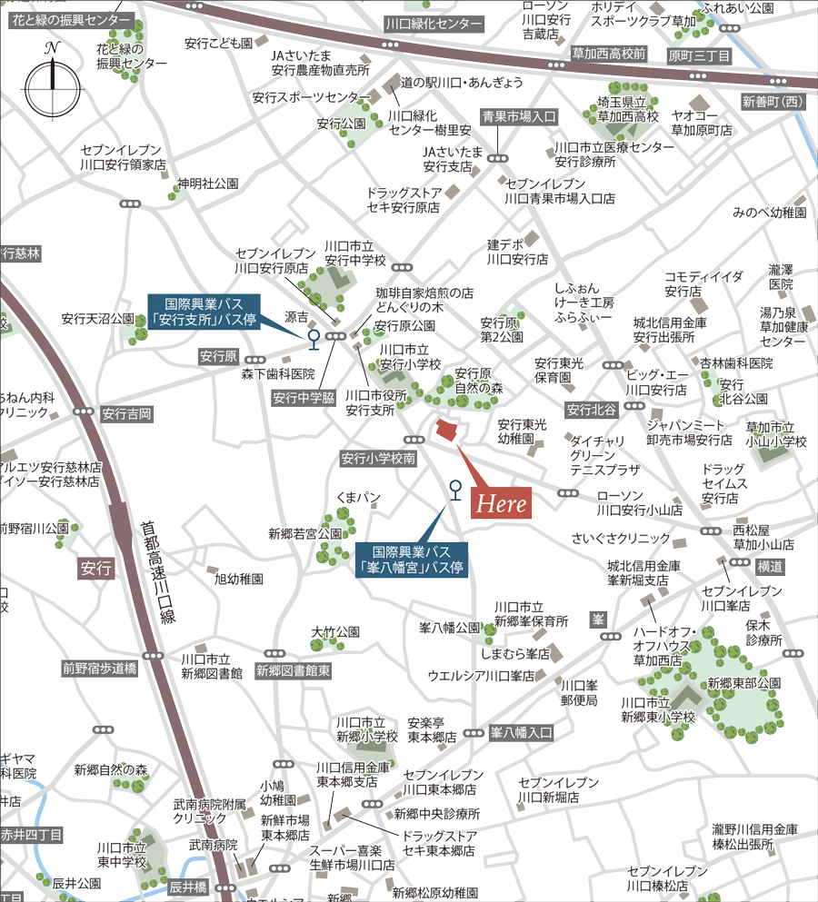 | 埼玉高速鉄道 埼玉スタジアム線「戸塚安行」駅 日暮里・舎人ライナー「見沼代親水公園」駅 埼玉高速鉄道 埼玉スタジアム線「新井宿」駅 埼玉高速鉄道 埼玉スタジアム線線「鳩ヶ谷」駅 東武スカイツリーライン線「獨協大学」駅 東武スカイツリーライン線「草加」駅 国際興業バス(のりば2/川13)「峯八幡宮」停 (乗車時間:「川口駅東口」停まで約35~37分) 国際興業バス(のりば10/川05)「峯八幡宮」停 (乗車時間:「戸塚安行駅」停まで約25分) 国際興業バス(のりば1・11)「安行支所」停 (乗車時間:「戸塚安行駅」停まで約10分、 「東川口駅南口」停まで約24分) 国際興業バス(のりば2・10)「安行支所」停 (乗車時間:「新井宿駅」停まで約10分) 国際興業バス(のりば3)「安行支所」停 (乗車時間:「西川口駅東口」停まで約38分) | 徒歩 36分 徒歩 37分 徒歩 40分 徒歩 43分 徒歩 43分 徒歩 46分 徒歩 5分 徒歩 6分 徒歩 8分 徒歩 8分 徒歩 8分 | ( 2,820m) ( 2,910m) ( 3,180m) ( 3,400m) ( 3,440m) ( 3,660m) ( 400m) ( 410m) ( 610m) ( 620m) ( 640m) |