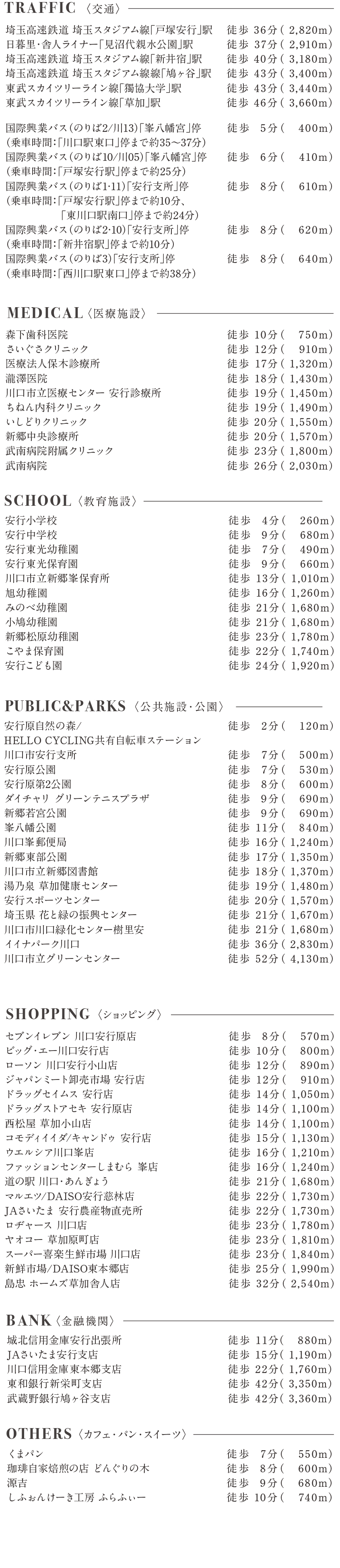 | 城北信用金庫安行出張所 JAさいたま安行支店 川口信用金庫東本郷支店 東和銀行新栄町支店 武蔵野銀行鳩ヶ谷支店 | 徒歩 11分徒歩 15分 徒歩 22分 徒歩 42分 徒歩 42分 | ( 880m) ( 1,190m) ( 1,760m) ( 3,350m) ( 3,360m) |