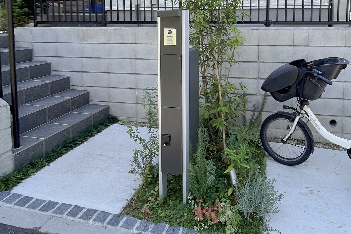 留守の間でも荷物の受け取りができる宅配ボックスを採用。落ち着きのある街のデザインと調和する、気品のある門柱とポストがエントランスの印象を引き締めます。