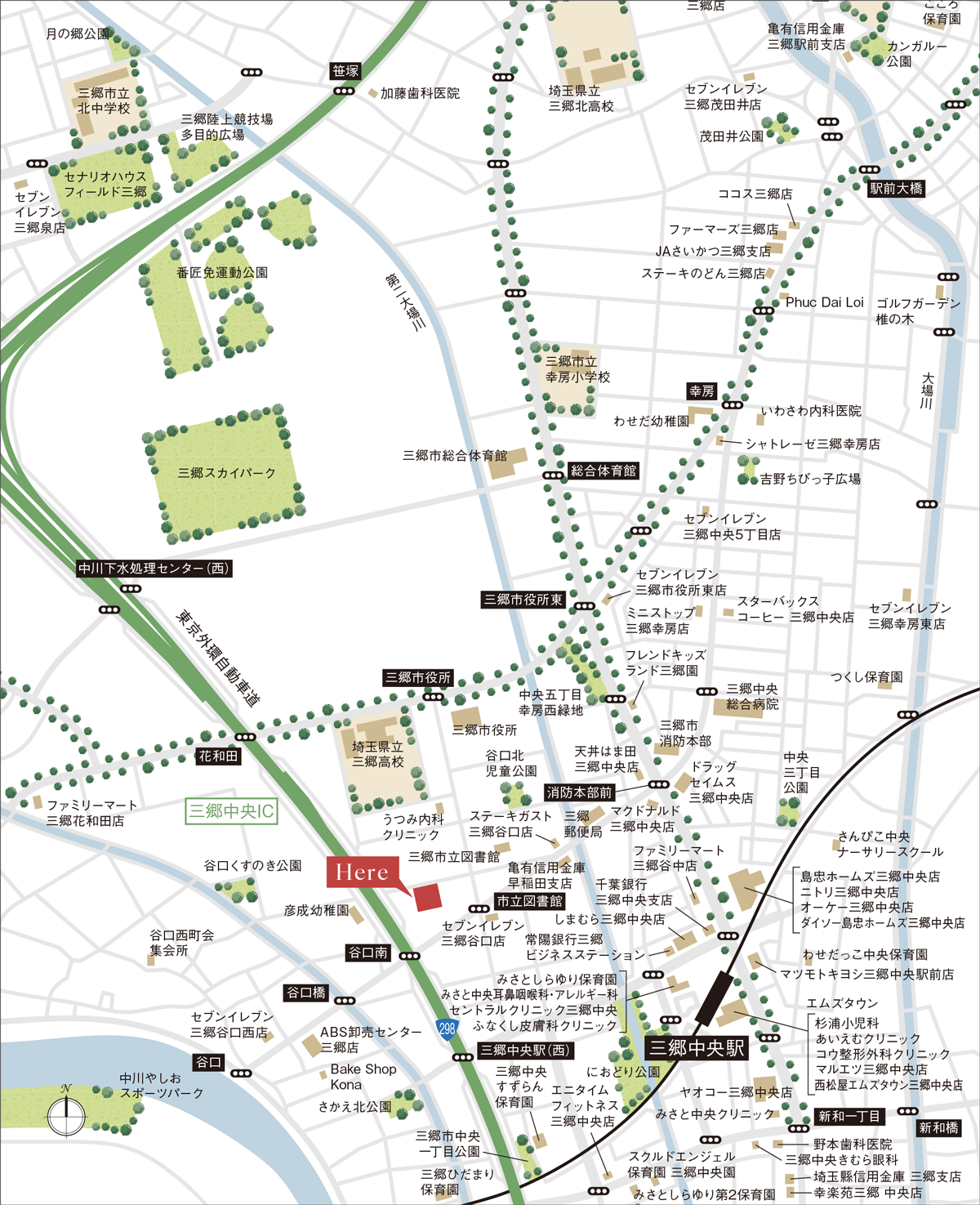 地図検索をご利用の際は「埼玉県三郷市谷口396付近」とご入力ください。