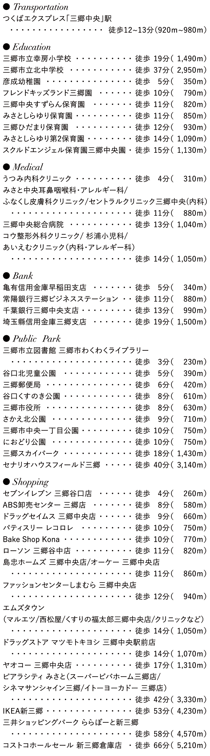 アクセス ●三郷中央駅より北千住駅まで【ラッシュ時: 9分 つくばエクスプレス区間快速(秋葉原行)利用。】【平常時: 9分 つくばエクスプレス区間快速(秋葉原行)利用。】