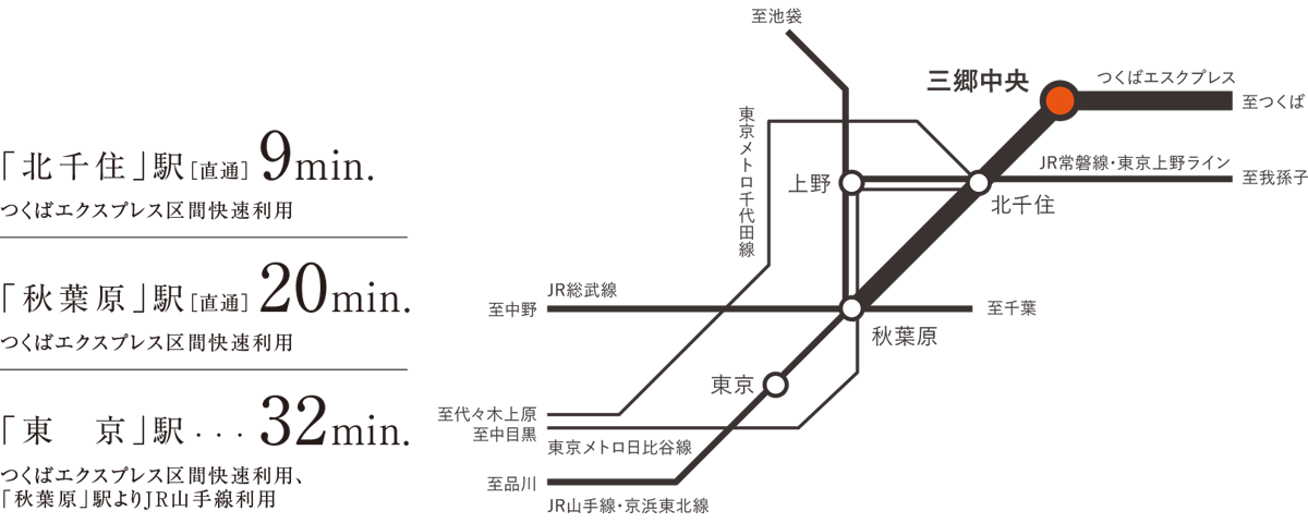 ●三郷中央駅より東京駅まで【ラッシュ時: 31分 つくばエクスプレス区間快速(秋葉原行)利用。秋葉原駅で山手線外回り東京方面行に乗換。】【平常時: 29分 つくばエクスプレス(秋葉原行)利用。八潮駅でつくばエクスプレス快速(秋葉原行)に乗換。北千住駅で常磐線特別快速(品川行)に乗換。】