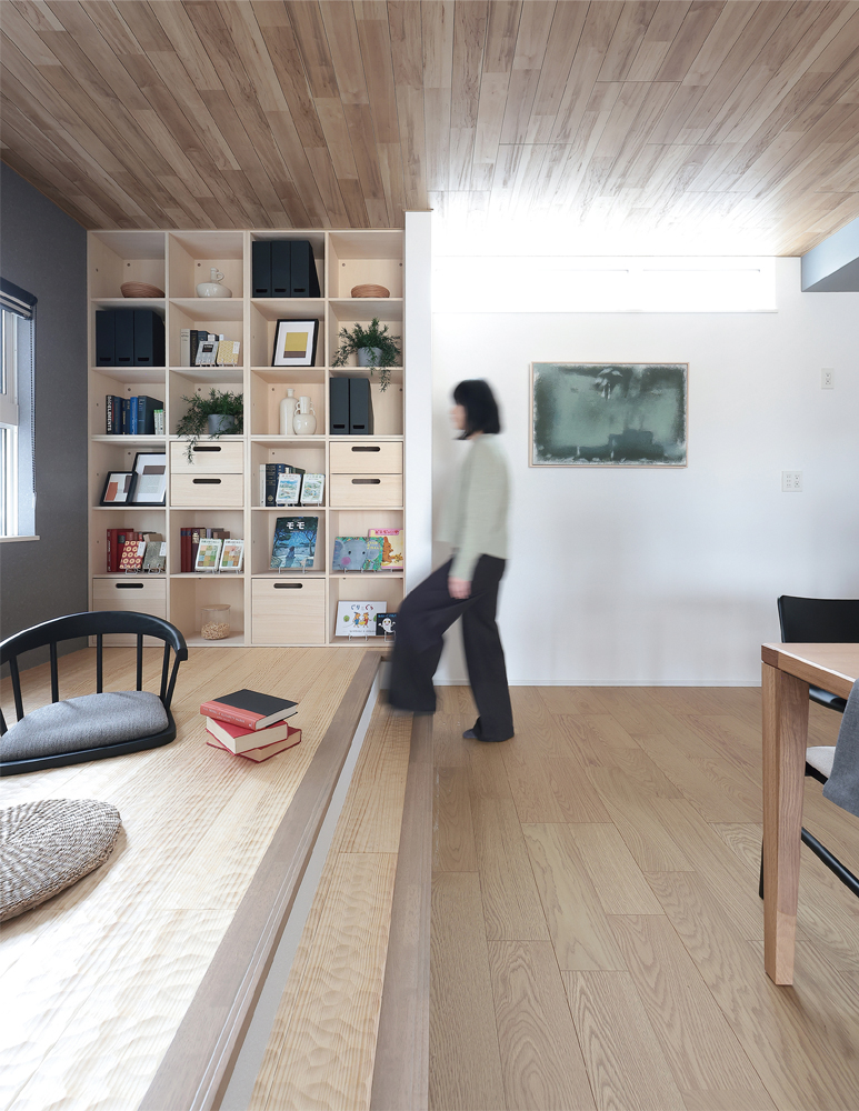 フロアレベルを一段上げ、掘机と本棚を設えたステージリビング。