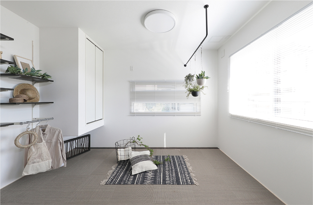 リビングの続き間にも、独立した部屋にもなるテキスタイルフロア敷きのマルチルーム。ハンギングレールやマルチシェルフを備え、洗濯物干しやアイロン掛けも楽々。趣味や軽い運動など、自在に使える空間です。