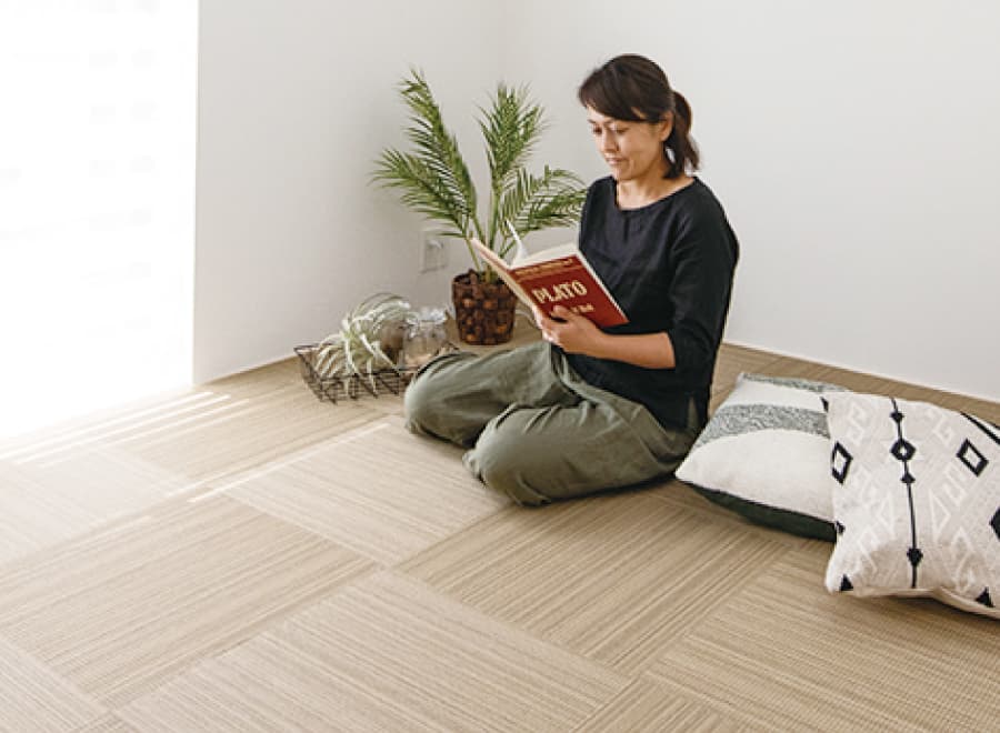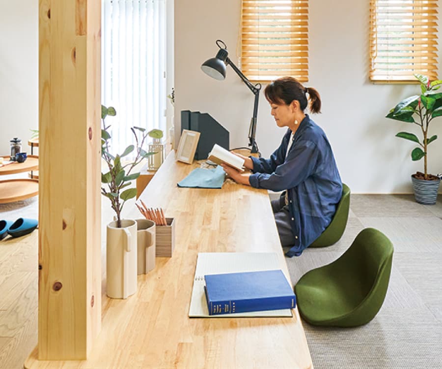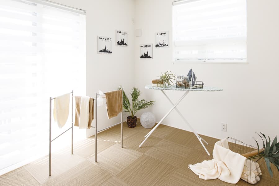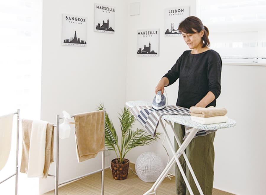 リビングとつながりながら、ゆとりあるスペースでアイロン掛けや取り込んだ洗濯物を畳めます。柔らかい素材のため、床にそのまま腰を下ろして楽な姿勢で家事ができます。