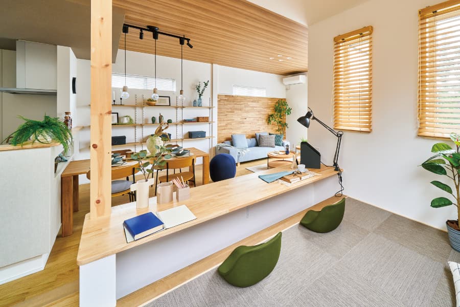 ◆小上がりの段差空間で仕事や勉強に集中できる「ステージリビング」