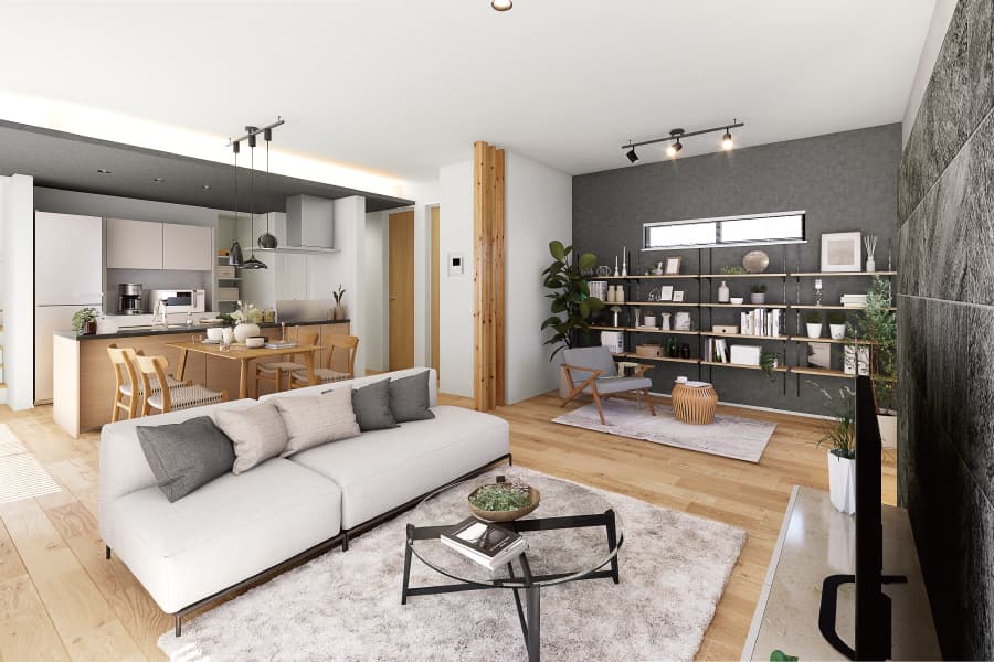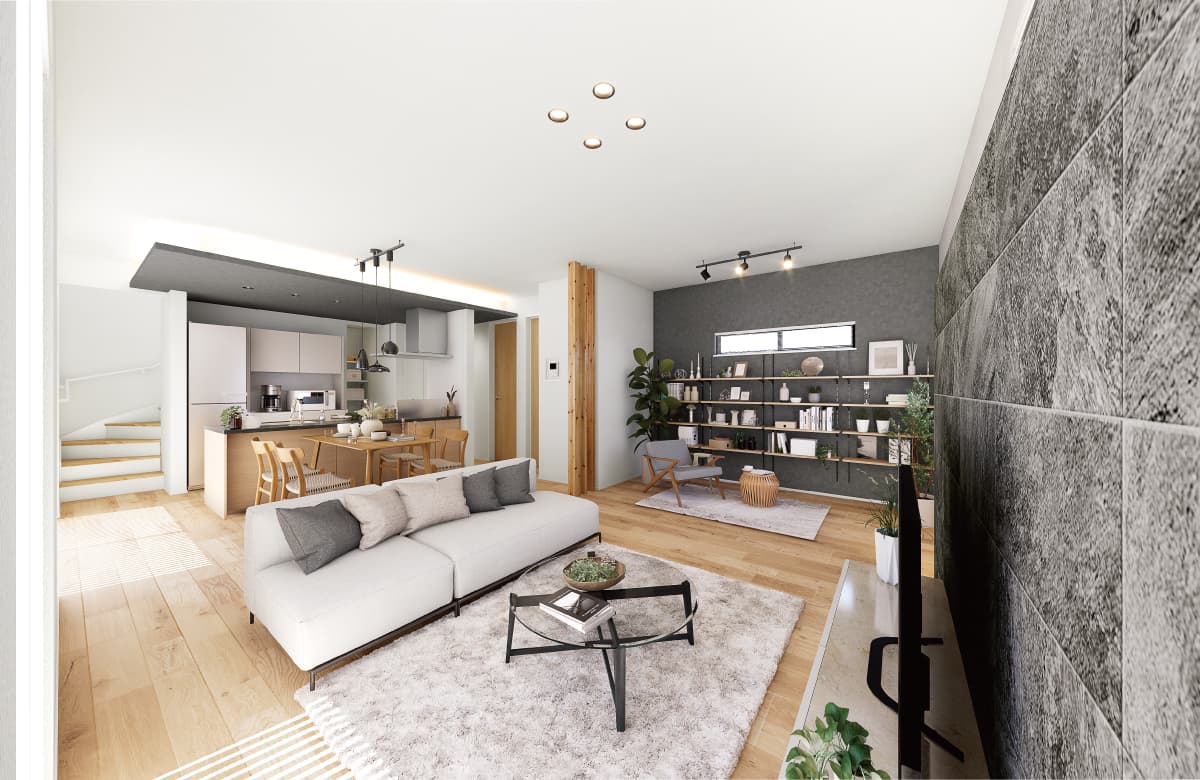 家族やゲストがゆったりと憩えるワイドリビング。家族みんなのコミュニケーションが自然と育まれながら、家事や趣味にも集中できる空間設計です。