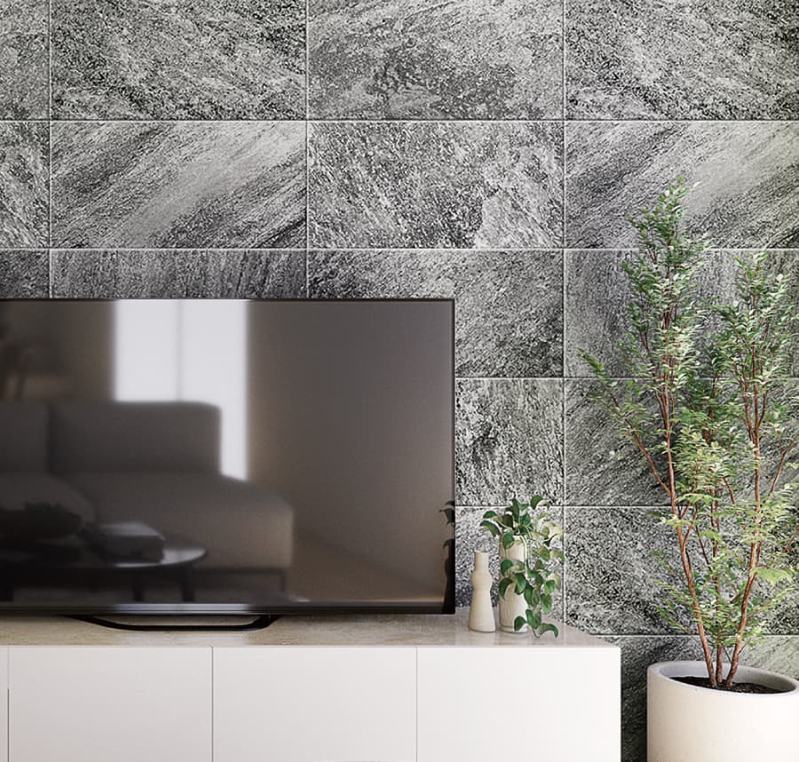 調湿機能付で石模様デザインが魅力の、デザイン性と機能性の揃ったアクセントウォール。家族が集まるリビングに落ち着きを演出します。