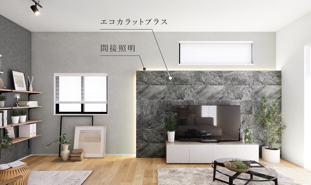 TV背面にエコカラットプラスと間接照明を組み合わせたアクセントボードを計画。上質な空間を演出します。