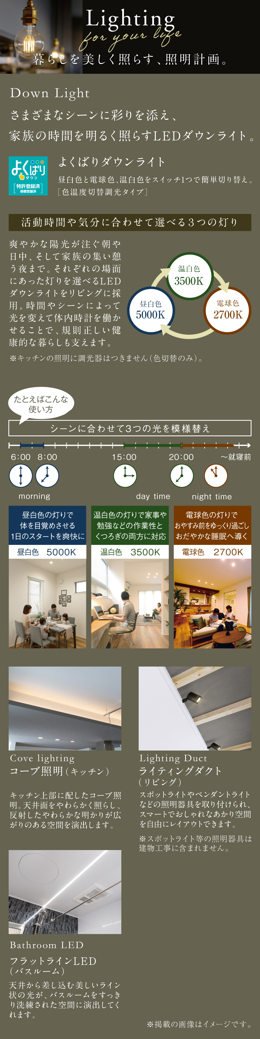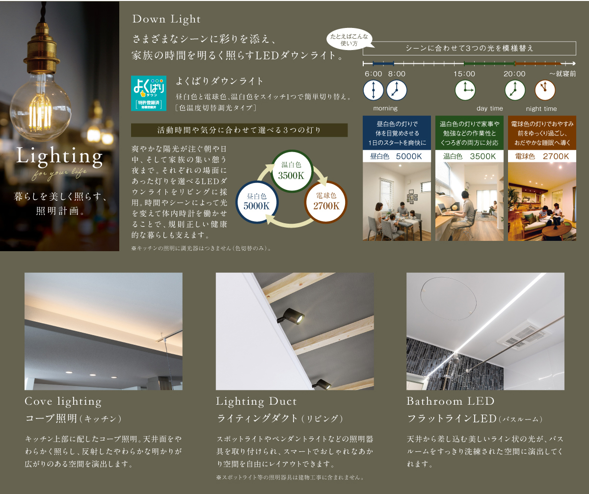 ・よくばりダウンライト・コープ照明・ライティングダクト(リビング)・フラットラインLED(バスルーム)