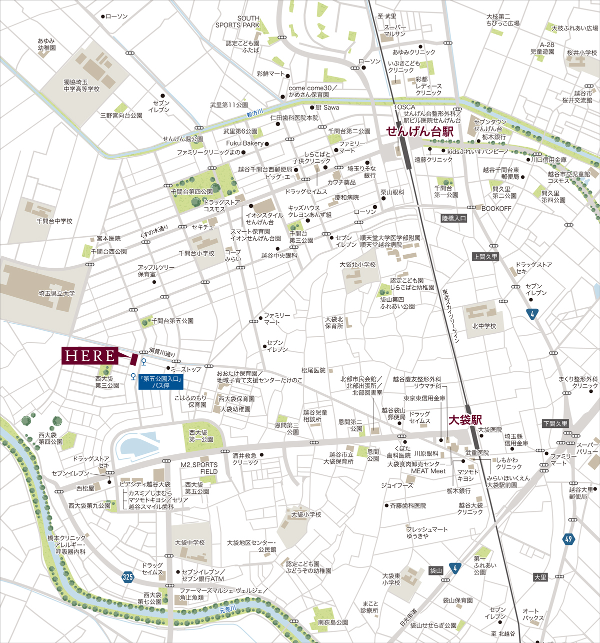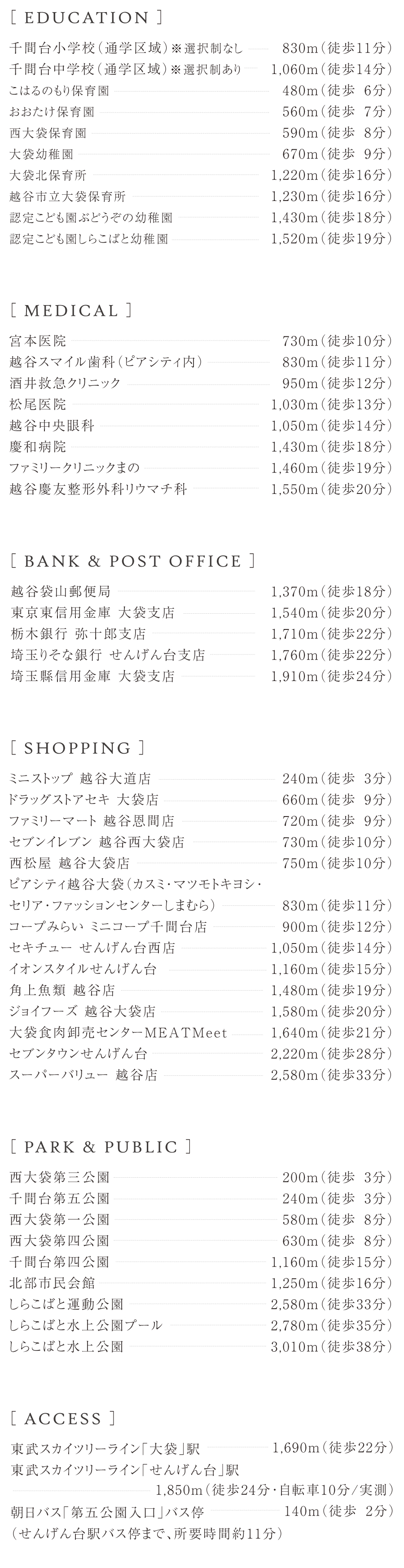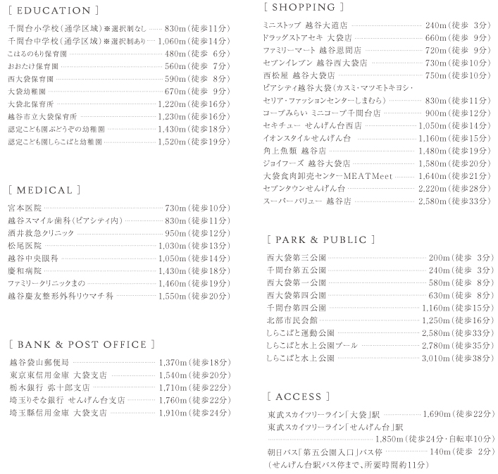 アクセス ●大袋駅より北千住駅まで【ラッシュ時: 23分 東武スカイツリーライン準急(長津田行)利用。】【平常時: 23分 東武スカイツリーライン準急(中央林間行)利用。】