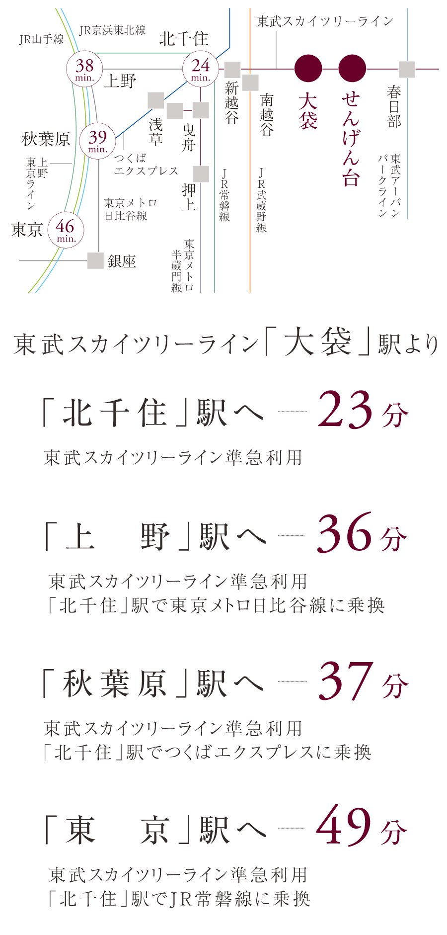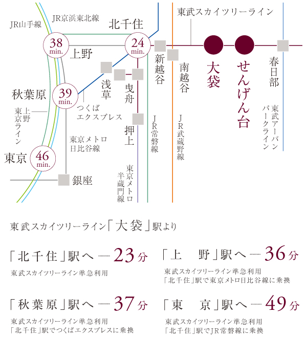 ●大袋駅より秋葉原駅まで【ラッシュ時: 37分 東武スカイツリーライン準急(長津田行)利用。北千住駅でつくばエクスプレス(秋葉原行)に乗換。】【平常時: 39分 東武スカイツリーライン準急(中央林間行)利用。北千住駅で東京メトロ日比谷線(中目黒行)に乗換。】