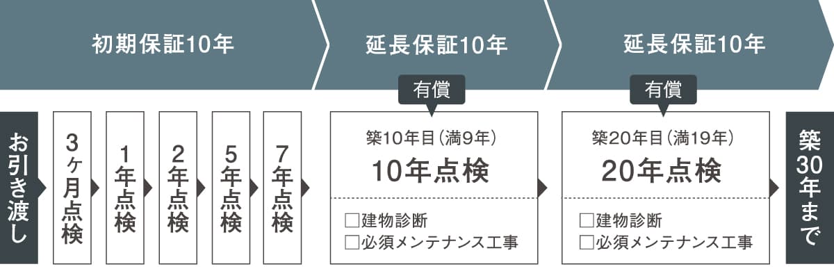 内装2年、白蟻5年、地盤・構造躯体10年や植栽(草花除く)も1年の保証があります。さらに10年毎に点検をうけていただき、必要な補修工事などをしていただくと躯体保証が最長30年まで延長されます。 ※10、20年点検には費用がかかります。定期的な点検を持続出来るため、長いお付き合いとなります。 | ![]() |