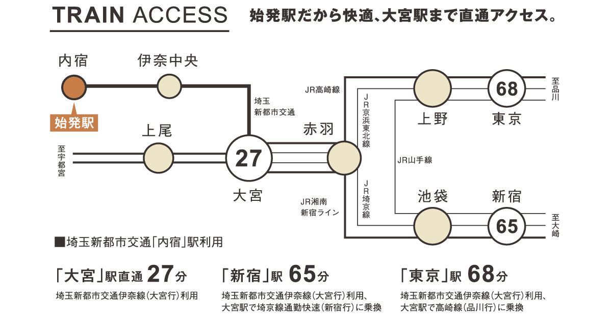 アクセス ●内宿駅より大宮駅まで【ラッシュ時: 27分 ニューシャトル(大宮行)利用。】