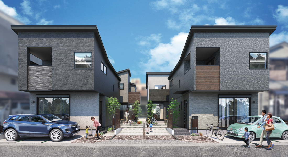 4邸のシンボリックな外観が描き出す、美しくコントラストのある街並。※掲載のパースは図面をもとに描き起こしたもので、実際とは多少異なります。