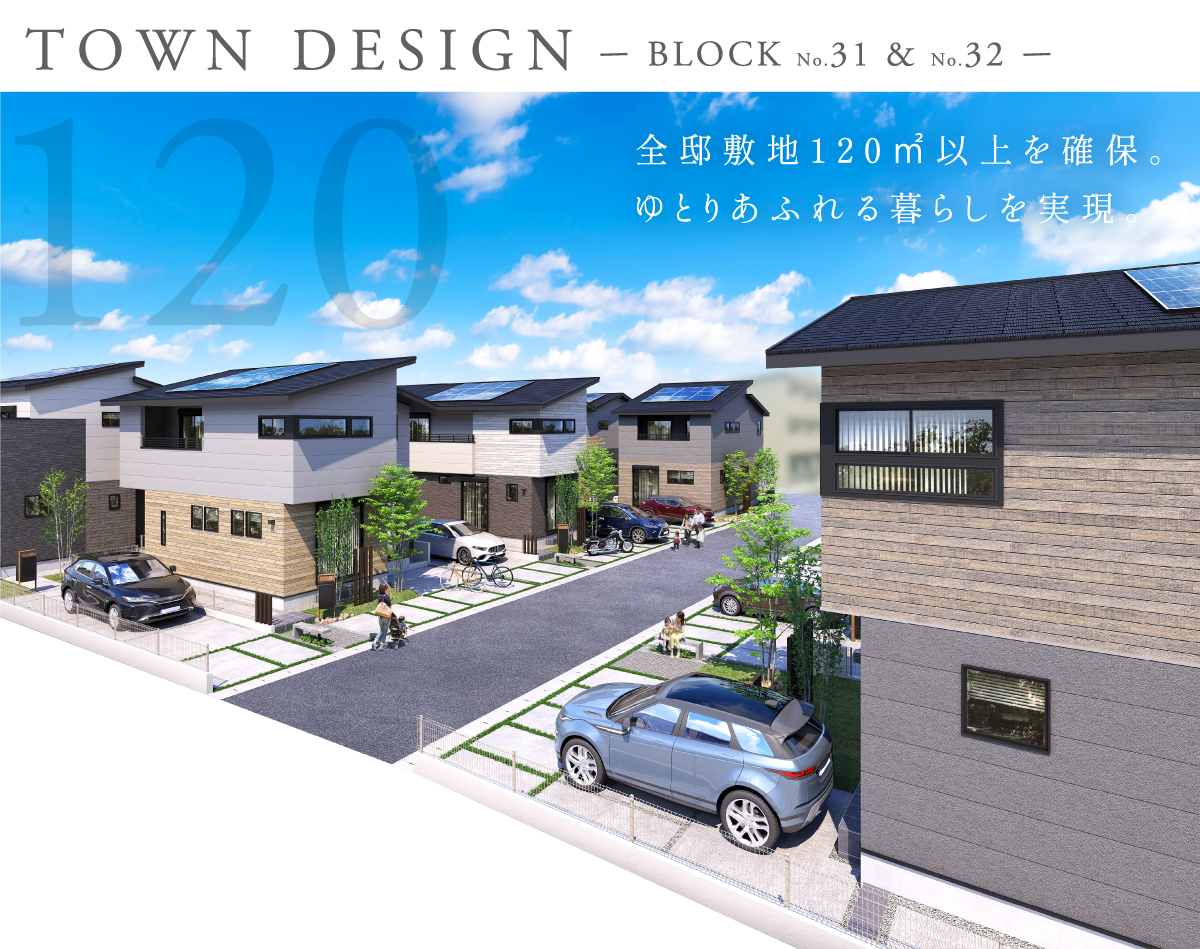 駅徒歩7分という立地にありながら、全邸ゆったりとした敷地120㎡以上を確保しています。