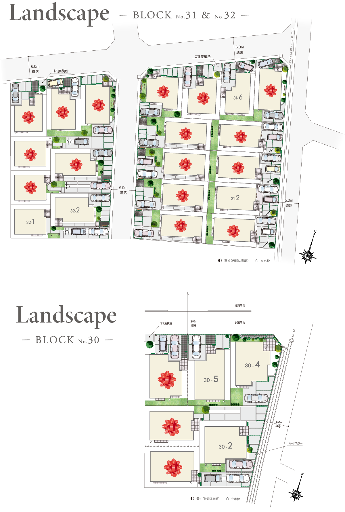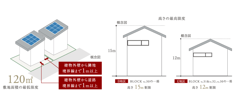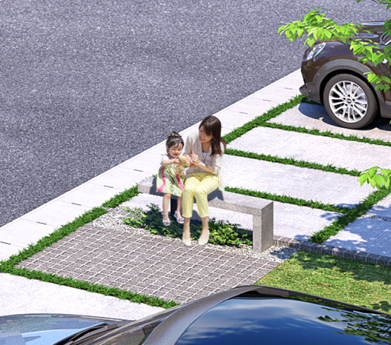 敷地間隔も充分に取ることで、どの住まいにもたっぷりと陽光が行き渡り、自然の風が通り抜ける街区形としています。