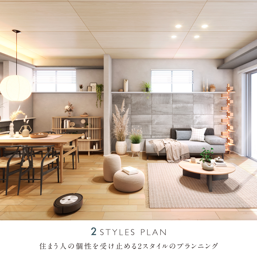 フローリングや建具の色を6種類のスタイルからお選びいただけるカラーセレクトをご用意しています。「バーチャル展示場」にてスタイル別シミュレーションをご確認いただけます。