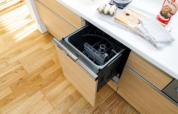 後片付けをサポートするビルトインタイプの食器洗浄乾燥機が標準装備。家事の時間短縮になるだけでなく、水道代の節約にもつながり一石二鳥です。
