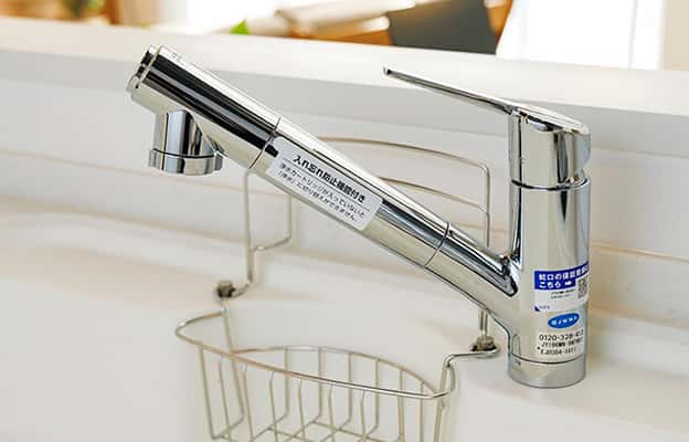 キッチン蛇口の先端に浄水機能を内蔵。塩素やそのほかの除去物質を蛇口先端ギリギリで除去し、水の安全性を考慮しました。一体型だからキッチンもスッキリ。