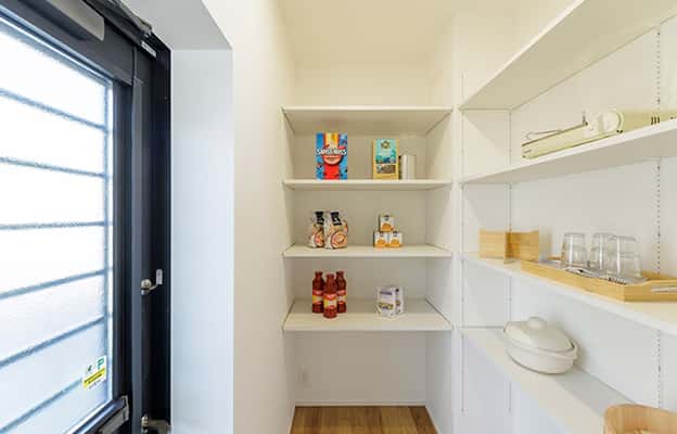 小物や食材で雑然としやすいキッチンにあると重宝するパントリー。食材のストックはもちろんキッチン用品なども収納しておくことができます。※号棟により採用状況が異なります。