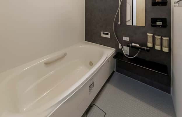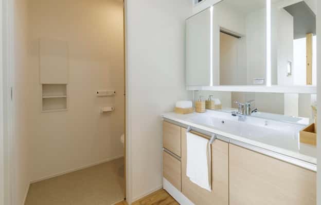 浴室には、ウルトラファインバブルを含むシルクミストが皮脂汚れを優しく洗い落とすエコアクアシャワーを標準採用。保温・保湿・血流促進効果もあります。