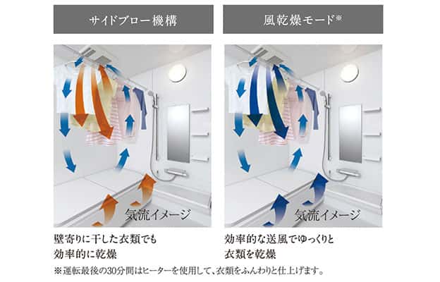サイドブロー機構で、壁寄りに干した衣類でも効率的に乾燥。風乾燥モードでは、効率的な送風でゆっくりと衣類を乾燥します。 -