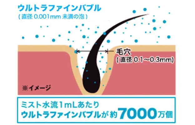 シルクミスト吐水モードでは「ウルトラファインバブル」を含んだやわらかな肌あたりのミストで、やさしく汚れを洗い流します。ミスト水流1mlあたりウルトラファインバブルが約7000万個含まれています。 -