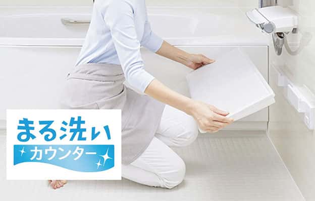 カウンターをまるごと壁から外して洗えるから、裏までピカピカに。洗いにくい壁や床もラクな姿勢で掃除できます。また、折りたたんで壁に掛けることができるので、洗い場を広く使えます。