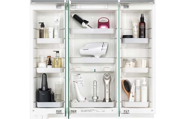 家電も小物も、いつも片づいた洗面室に。置き場所に困るヘアドライヤーやシェイバーはもちろん、内部にコンセントが設置されているので、毎日使う電動歯ブラシも充電しながら収納できます。 -