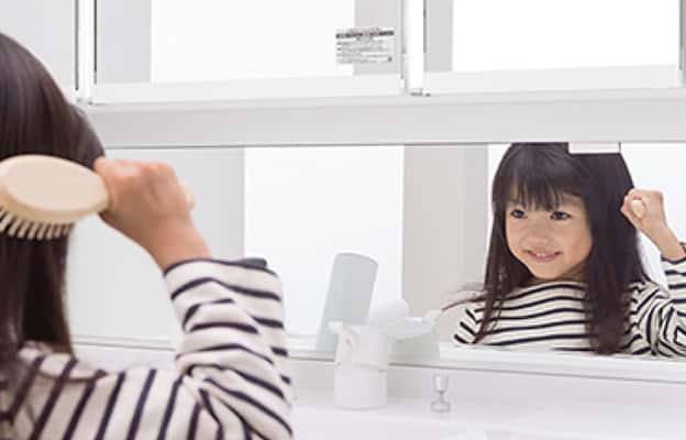 お子様の目線の高さに鏡を設置しました。台に乗らなくても顔が映るので、一人でも身支度しやすい仕様です。 -
