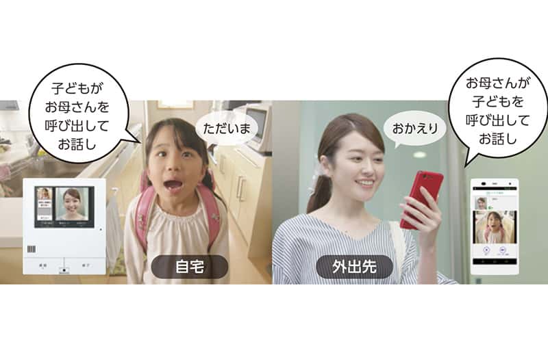 モニター親機から通話相手を選択して呼出ボタンを押すだけで、登録済のスマートフォンを呼び出し、顔を見ながらビデオ通話ができます。また、外出中の親御さんのスマートフォンから、留守番中のお子様を呼び出して会話をすることもでき、便利です。