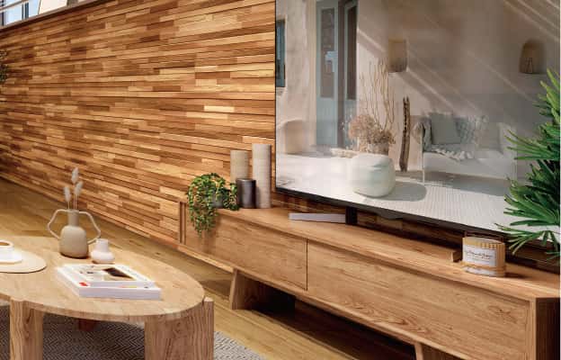 天然の銘木に凹凸加工を施し、その立体感と陰影が木目の美しさを引き立てる無垢の壁材。天然木特有の風合いや表情が魅力。 -
