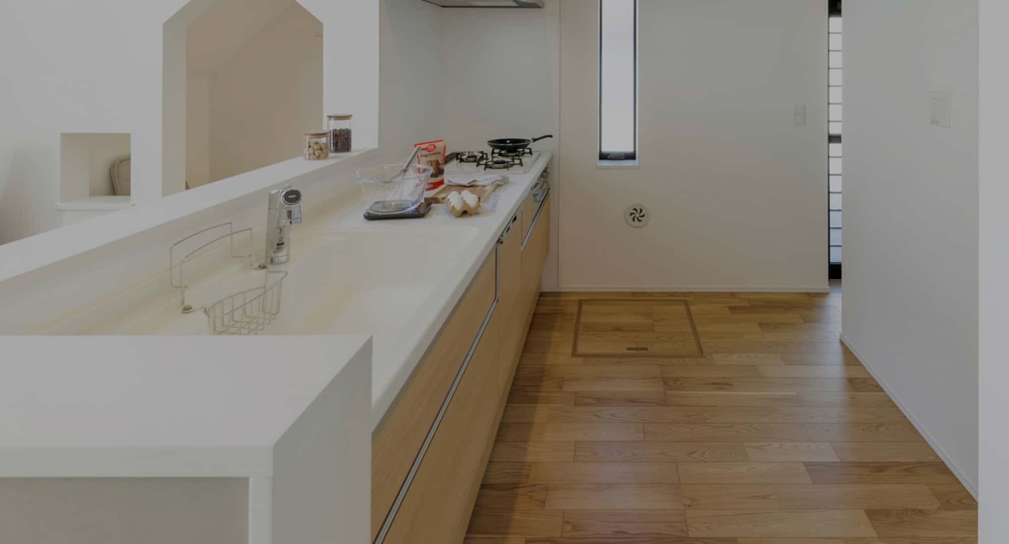 側板を下部に収めることですっきりとした印象に。掃除もしやすく、家族の暮らしに寄り添うやさしい室内設計にしました。 -