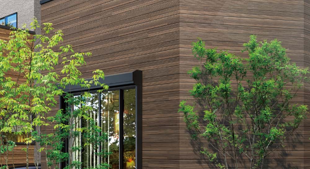 自然豊かな質感を創出する木目調の外壁は植栽と馴染み柔らかな印象を与えます。 -
