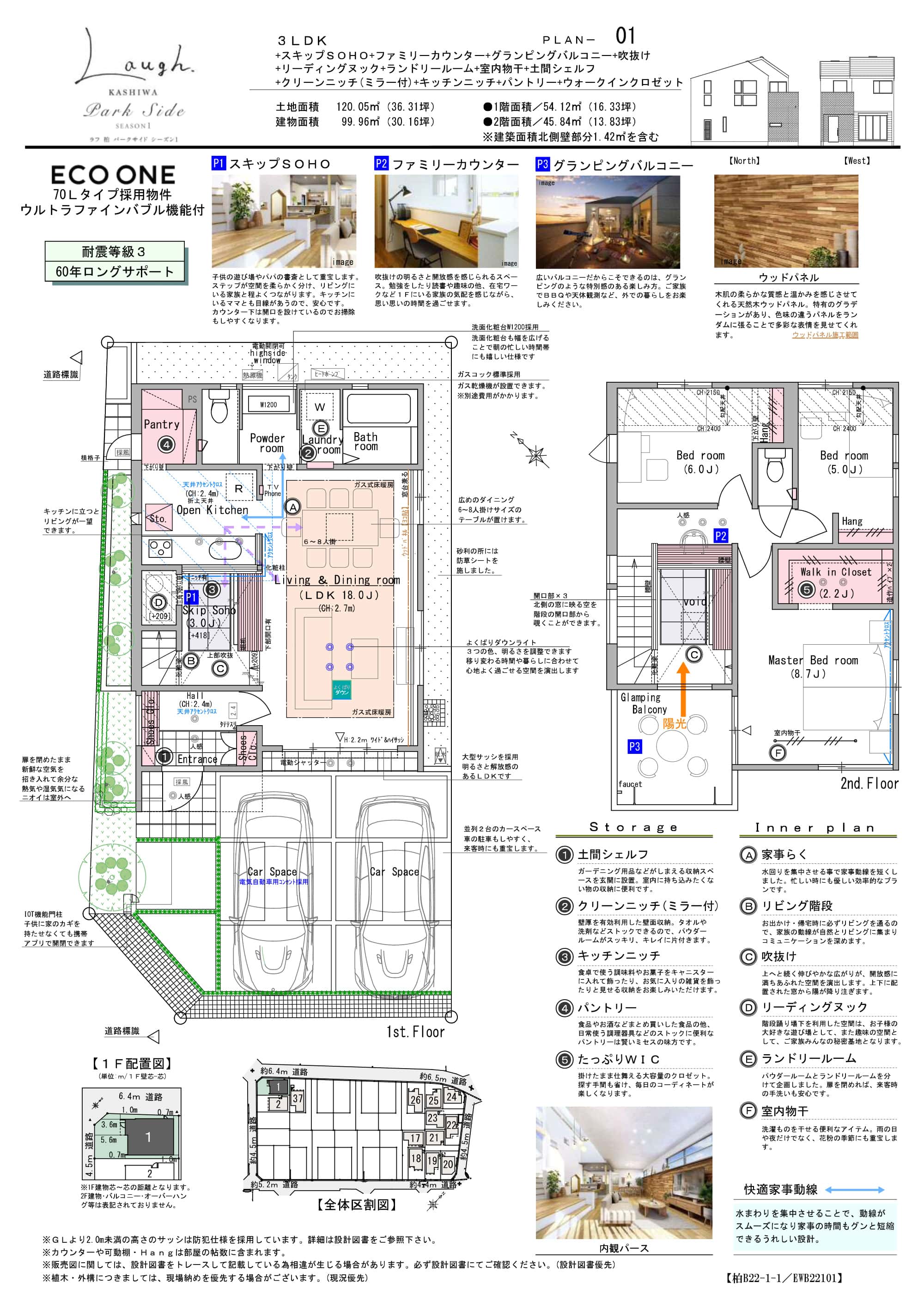 3LDK+スキップSOHO+ファミリーカウンター+グランピングバルコニー+吹抜け+リーディングヌック+ランドリールーム+室内物干+土間シェルフ +クリーンニッチ(ミラー付)+キッチンニッチ+パントリー+ウォークインクロゼット