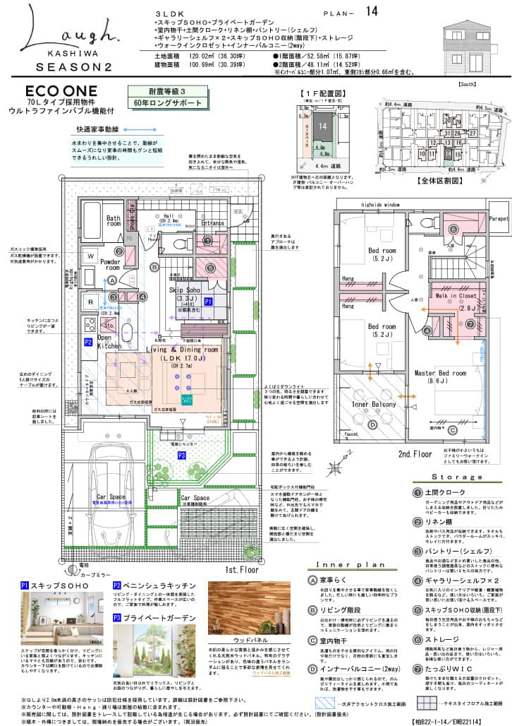 3LDK+スキップSOHO+プライベートガーデン+室内物干+土間クローク+リネン棚+パントリー(シェルフ) +ギャラリーシェルフ×2+スキップSOHO収納(階段下)+ストレージ +ウォークインクロゼット+インナーバルコニー(2way)