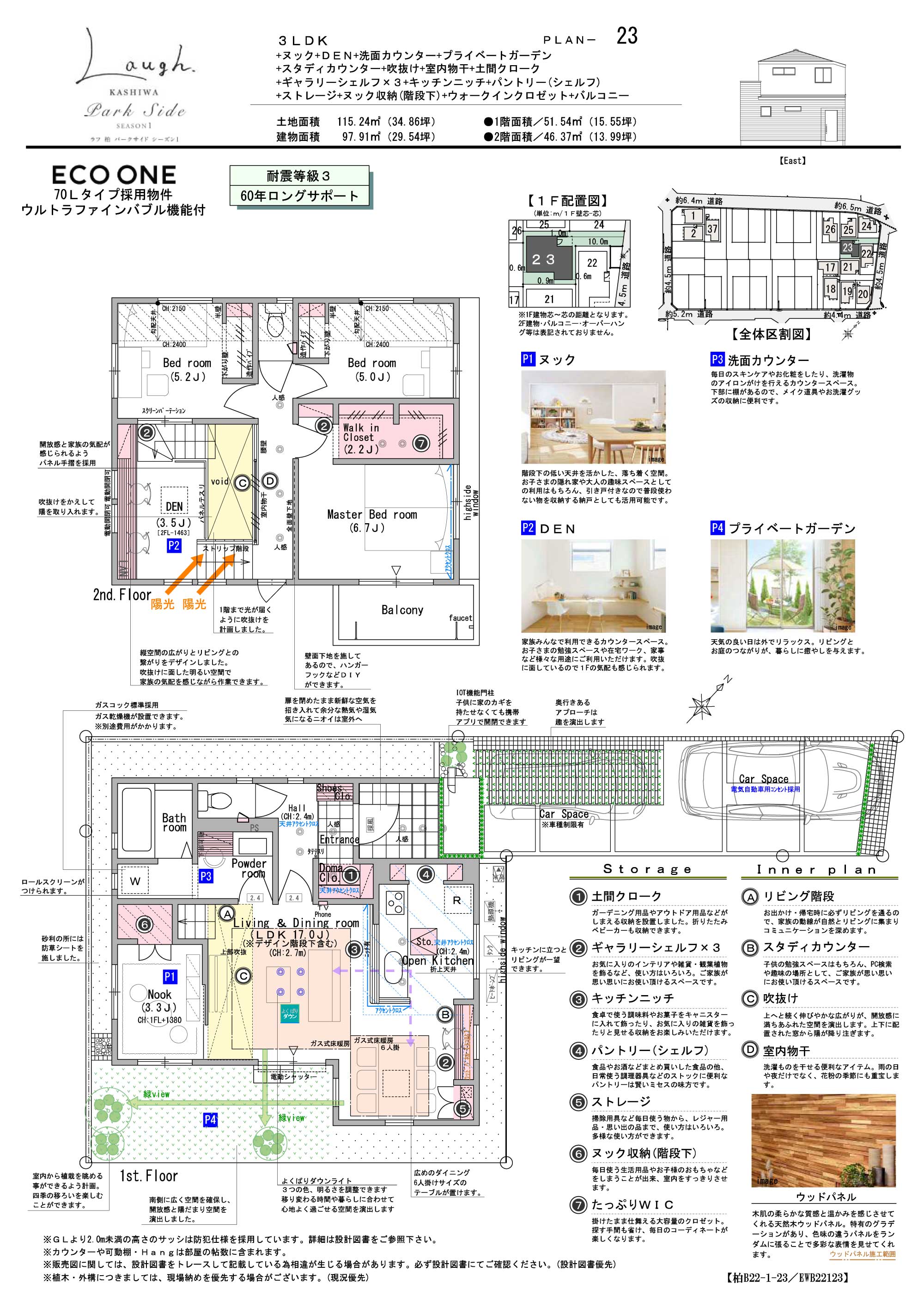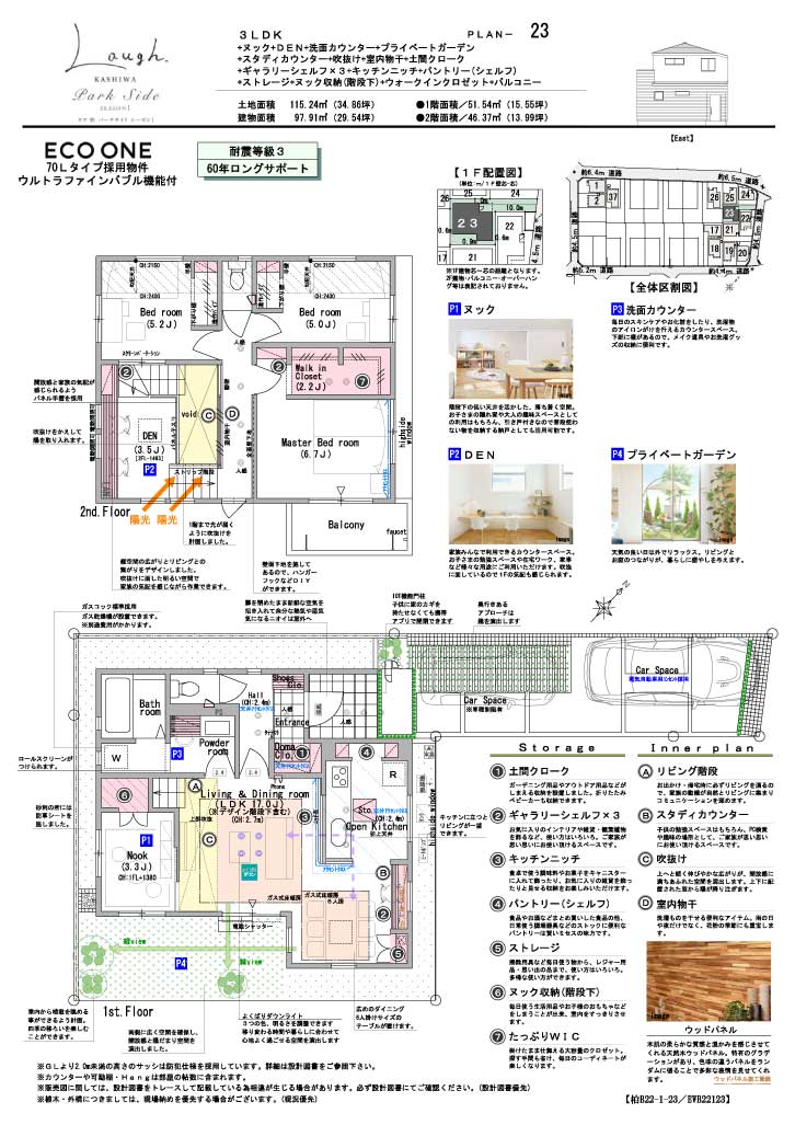 3LDK+ヌック+DEN+洗面カウンター+プライベートガーデン+スタディカウンター+吹抜け+室内物干+土間クローク+ギャラリーシェルフ×3+キッチンニッチ+パントリー(シェルフ)+ストレージ+ヌック収納(階段下)+ウォークインクロゼット+バルコニー