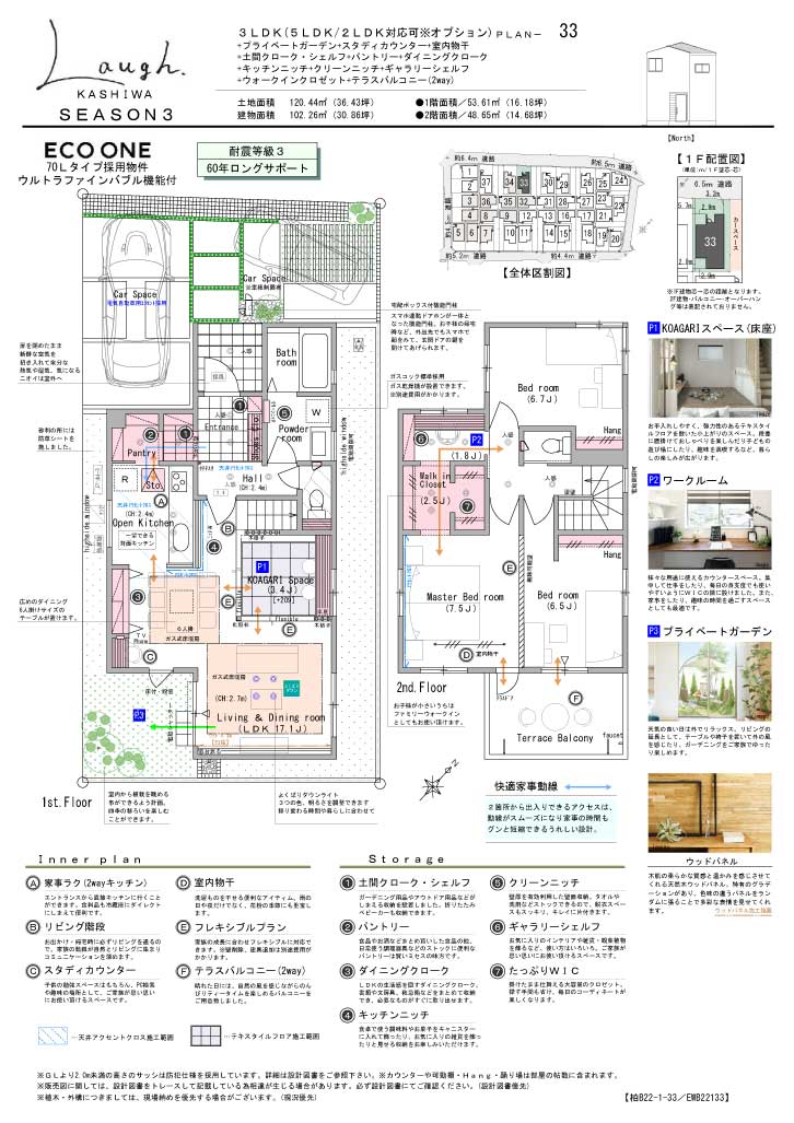 3LDK(5LDK/2LDK対応可※オプション)+プライベートガーデン+スタディカウンター+室内物干+土間クローク・シェルフ+パントリー+ダイニングクローク+キッチンニッチ+クリーンニッチ+ギャラリーシェルフ+ウォークインクロゼット+テラスバルコニー(2way)
