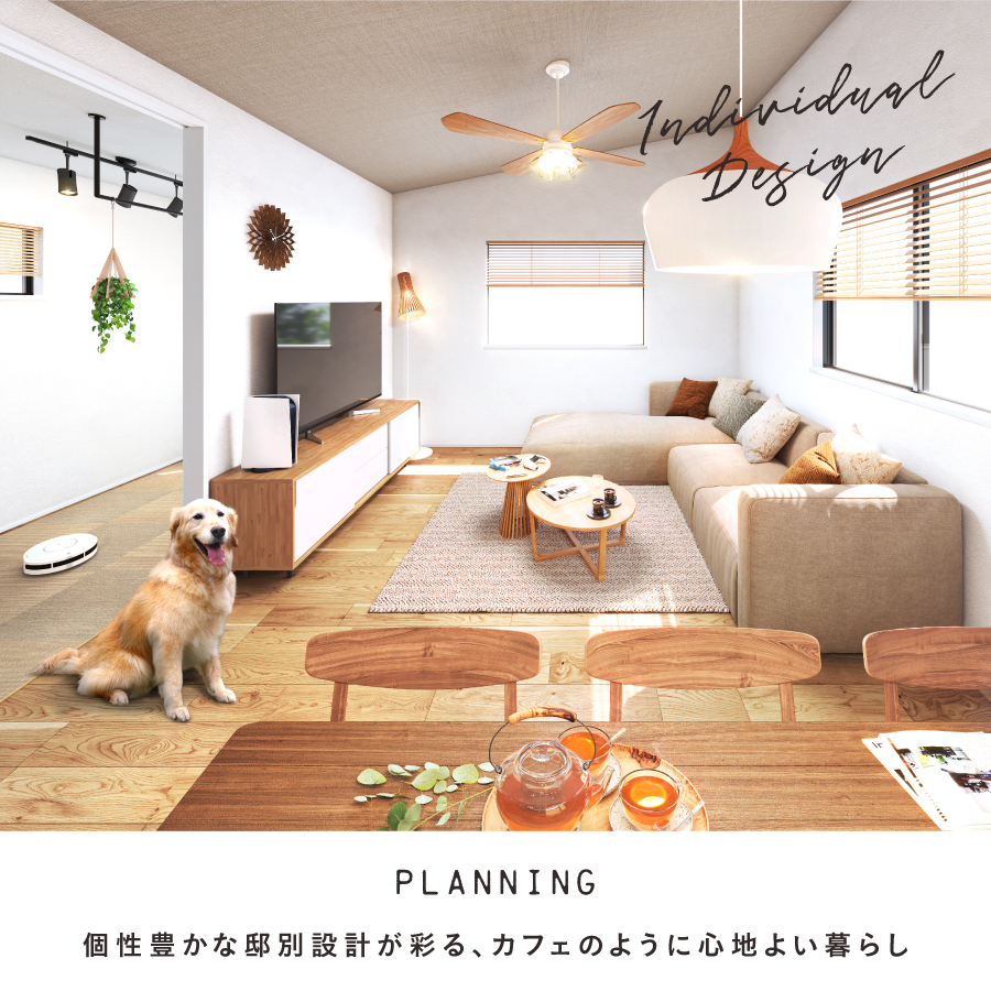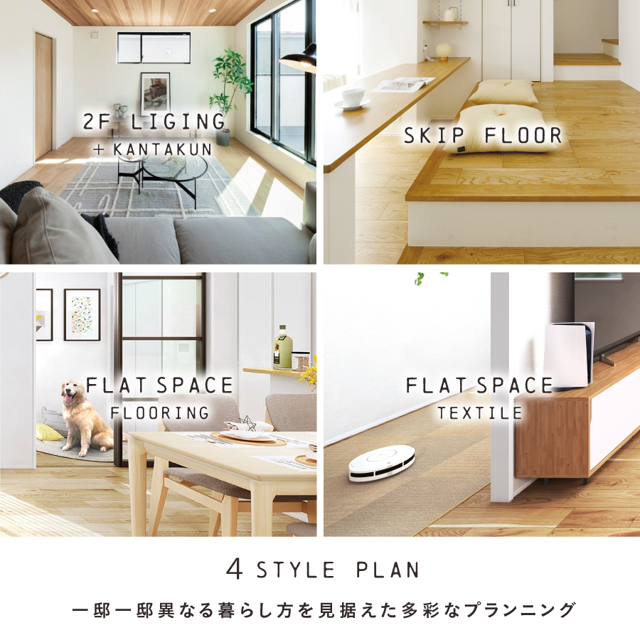 フローリングや建具の色を6種類のスタイルからお選びいただけるカラーセレクトをご用意しています。「バーチャル展示場」にてスタイル別シミュレーションをご確認いただけます。