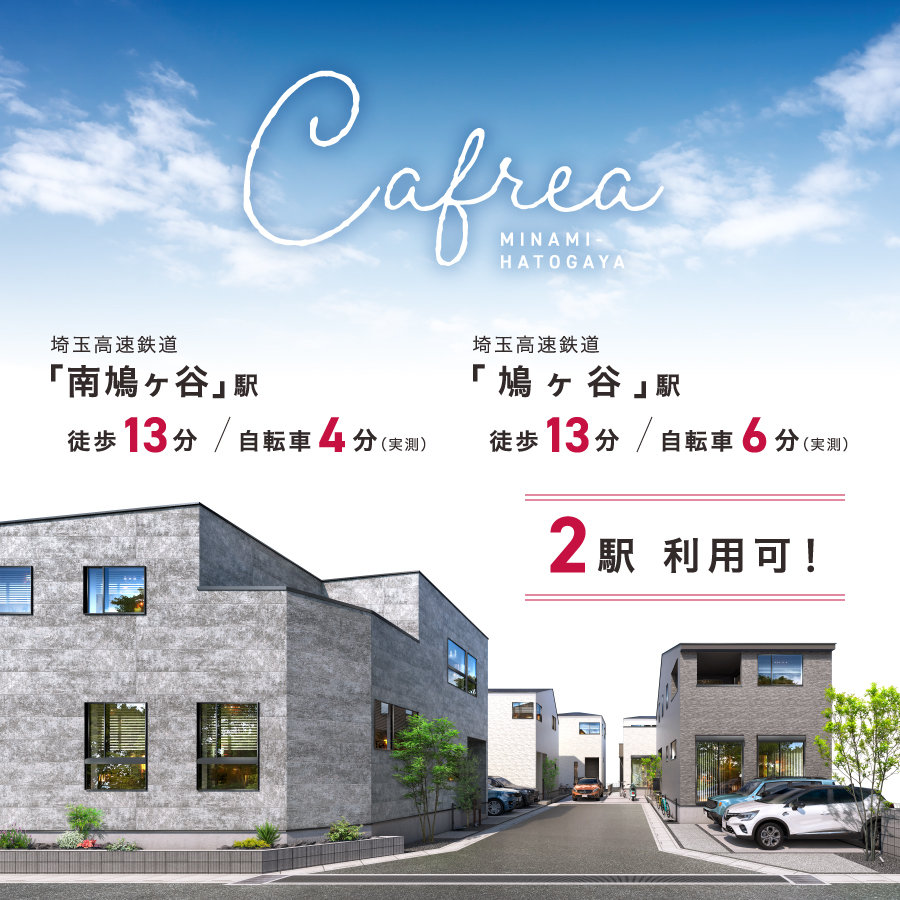 【2駅が徒歩13分で利用可】埼玉高速鉄道「南鳩ヶ谷」駅 徒歩13分/「鳩ヶ谷」駅 徒歩13分■彩りあるカフェ時間を愉しめる全5邸の街■石目調の素材感やシャープなシルエットが緑の街並み■個性が映える邸別設計■動線に配慮したバルコニー■カースペース2台対応号棟有■夜道を照らす「灯かりのいえなみ協定(R)」≪近隣モデルハウス公開!見学予約受付中≫◆見学予約ボタンまたはフリーコール【0120-208-069】にてお問い合わせください!