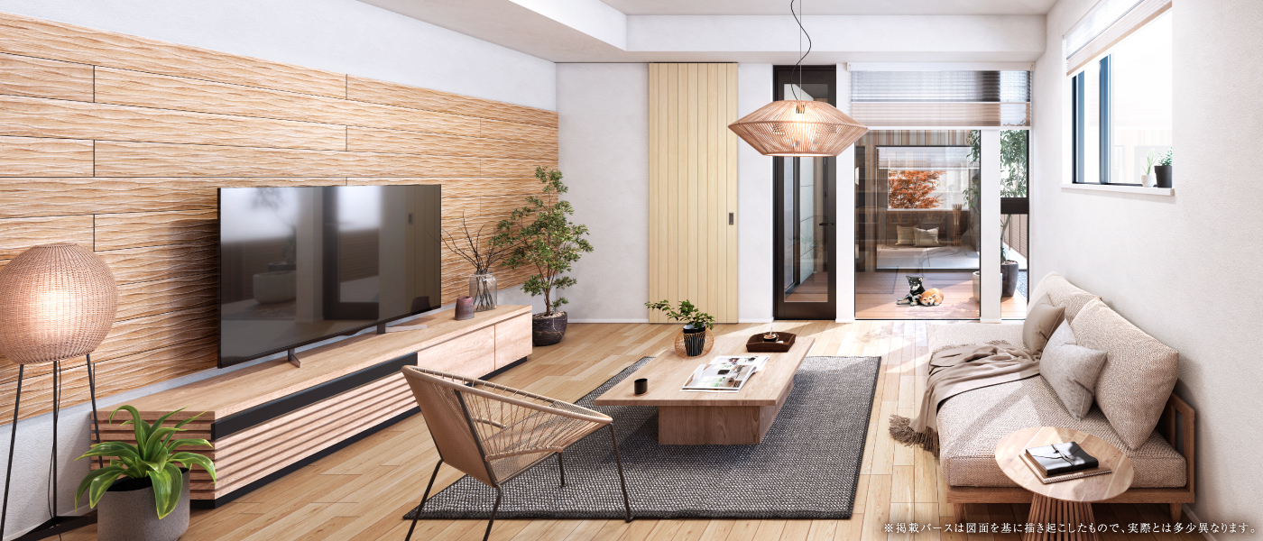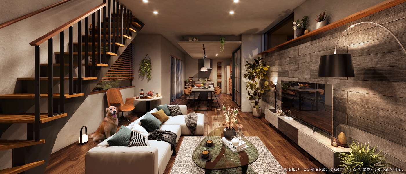 日本の伝統的な家屋のようなデザイン性の高いLDKと外とつながる魅力に溢れた住まい