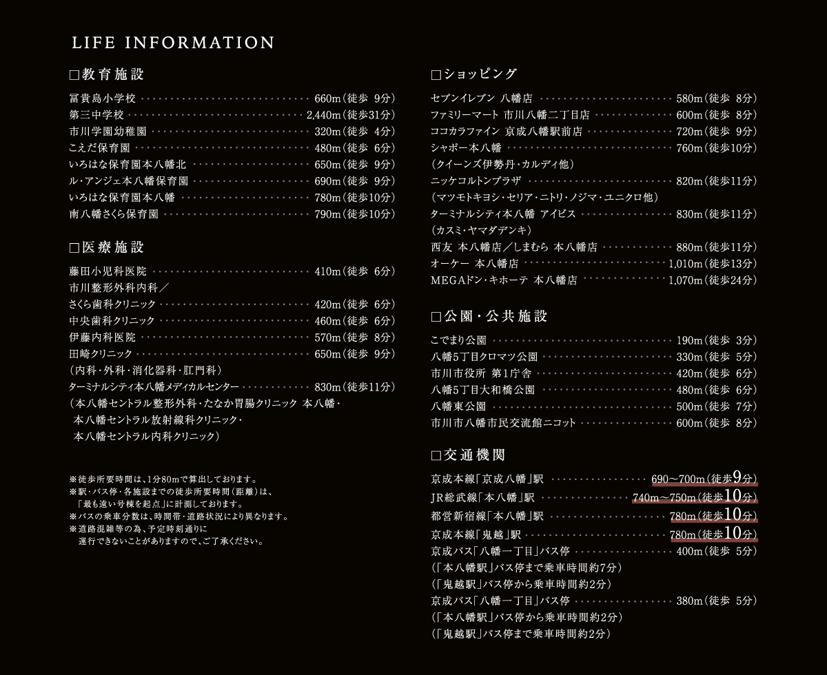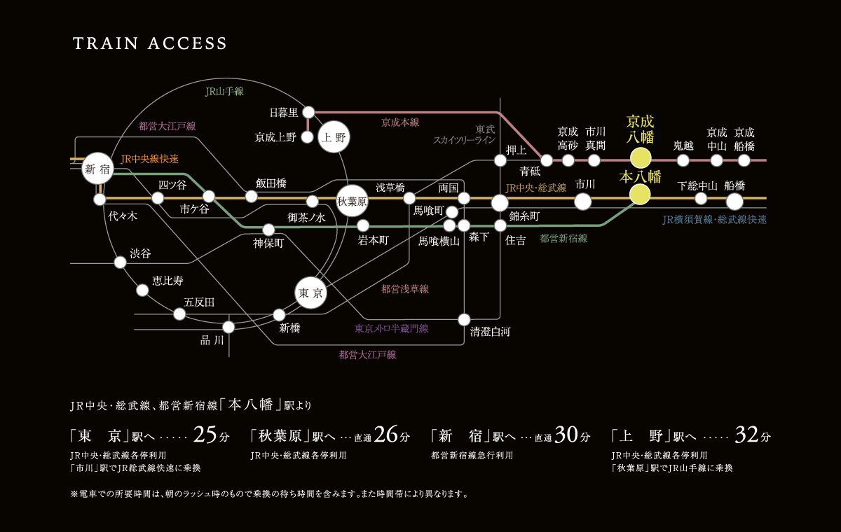 アクセス ●本八幡駅より東京駅まで【ラッシュ時: 25分 中央・総武線各停(三鷹行)利用。市川駅で総武線快速(大船行)に乗換。】【平常時: 24分 中央・総武線各停(中野行)利用。市川駅で総武線快速(久里浜行)に乗換。】