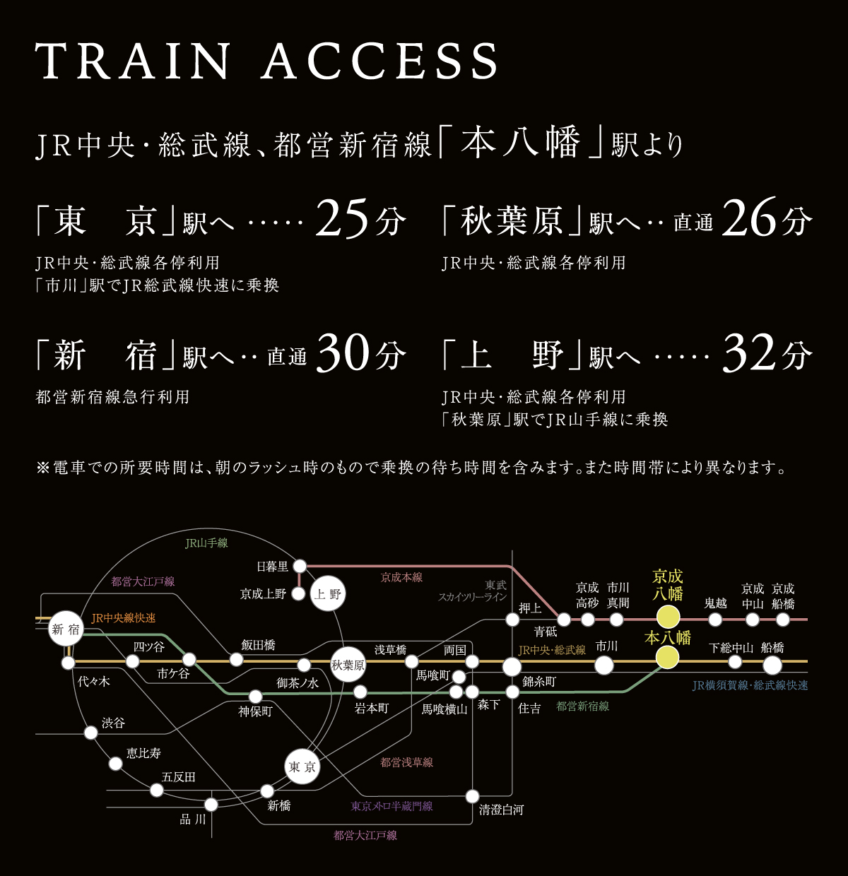 ●本八幡駅より秋葉原駅まで【ラッシュ時: 26分 中央・総武線各停(中野行)利用。】【平常時: 22分 中央・総武線各停(中野行)利用。】